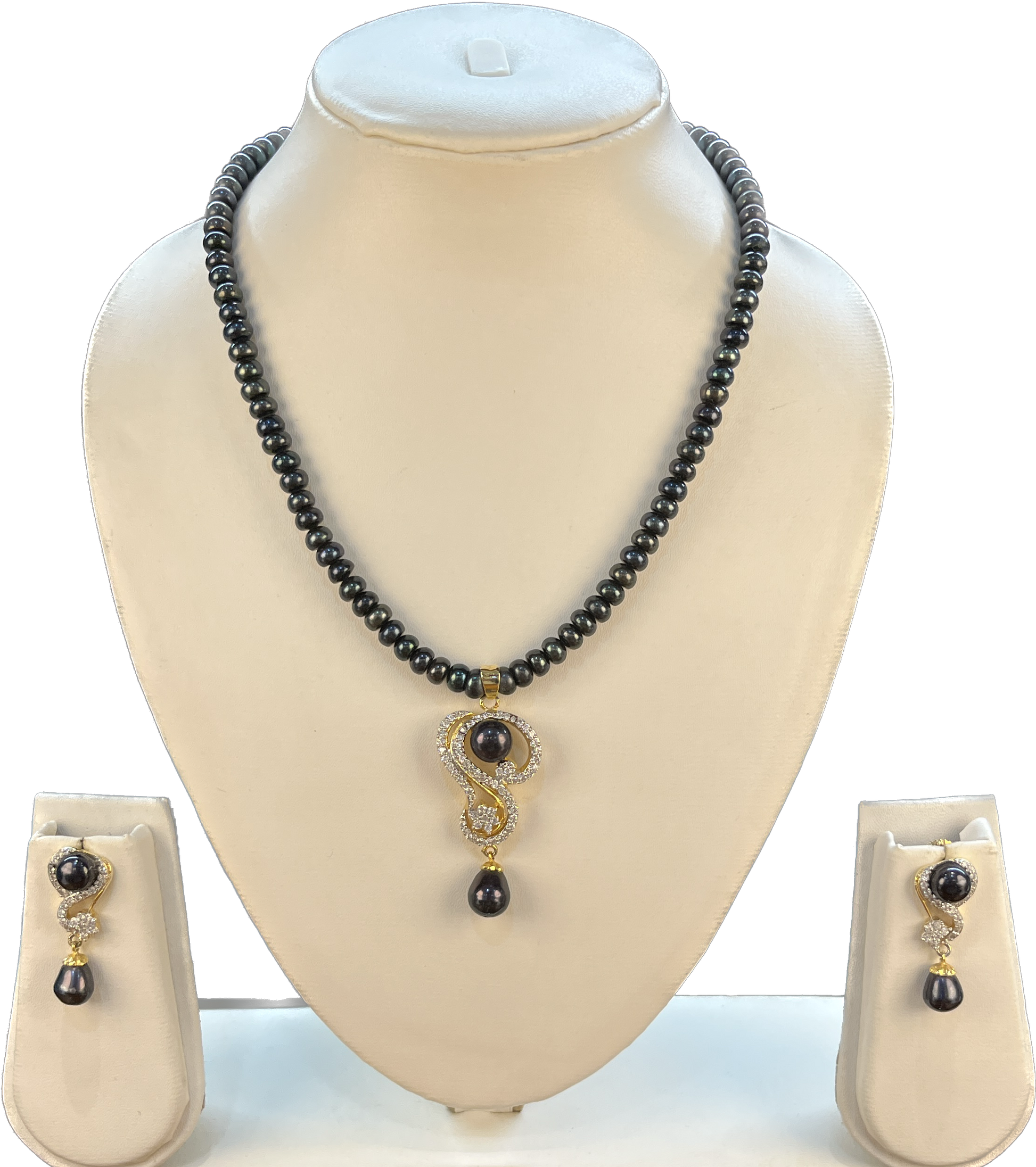 Single strand mesmerizing ~ 7 mm black freshwater round pearl set with dazzling black pearl and CZ studded pendant. Comes with matching earrings.