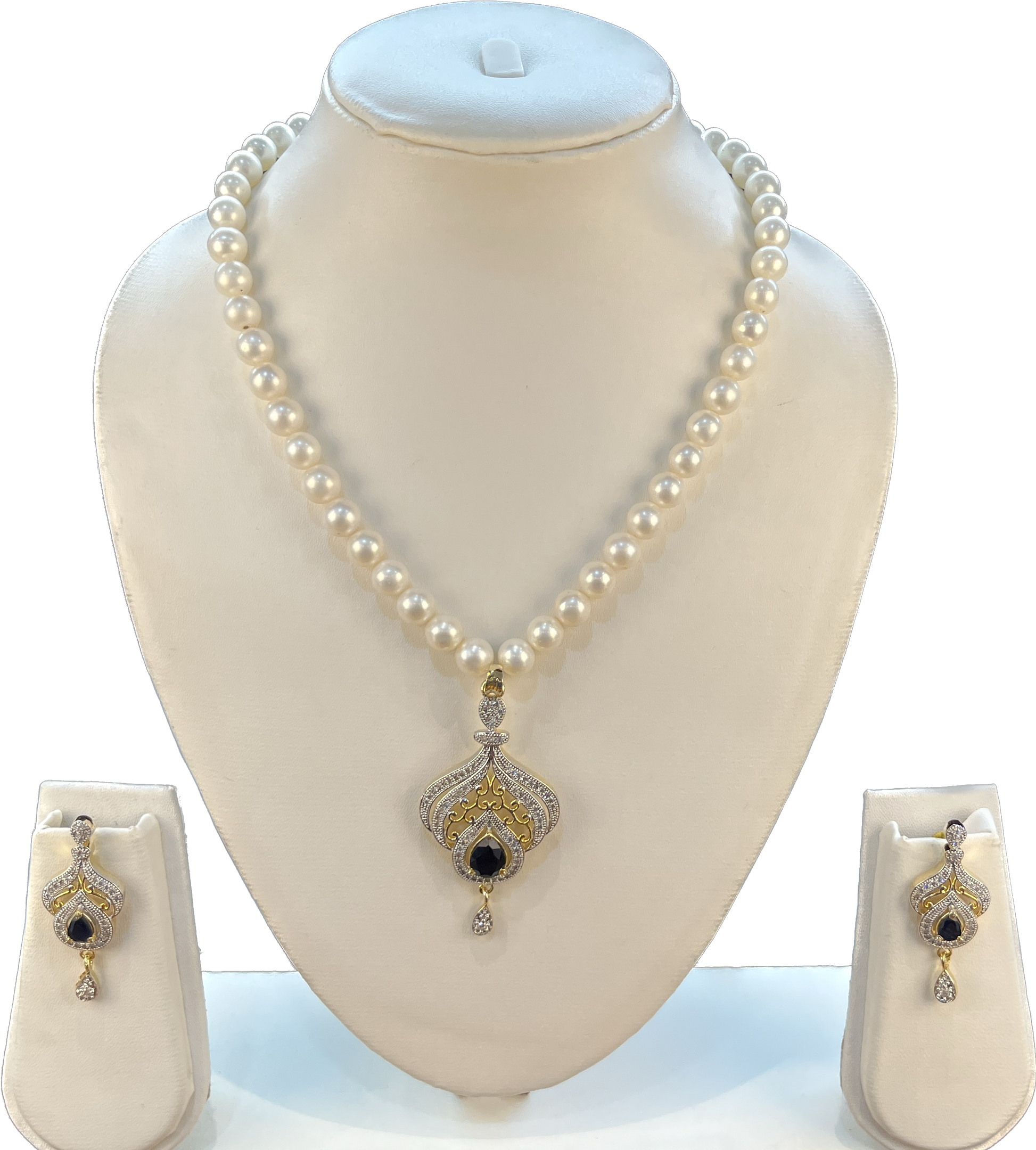 Magnificent ~ 8 mm white round freshwater pearls set with beauteous CZ studded hanging pendant. Comes with matching earrings.