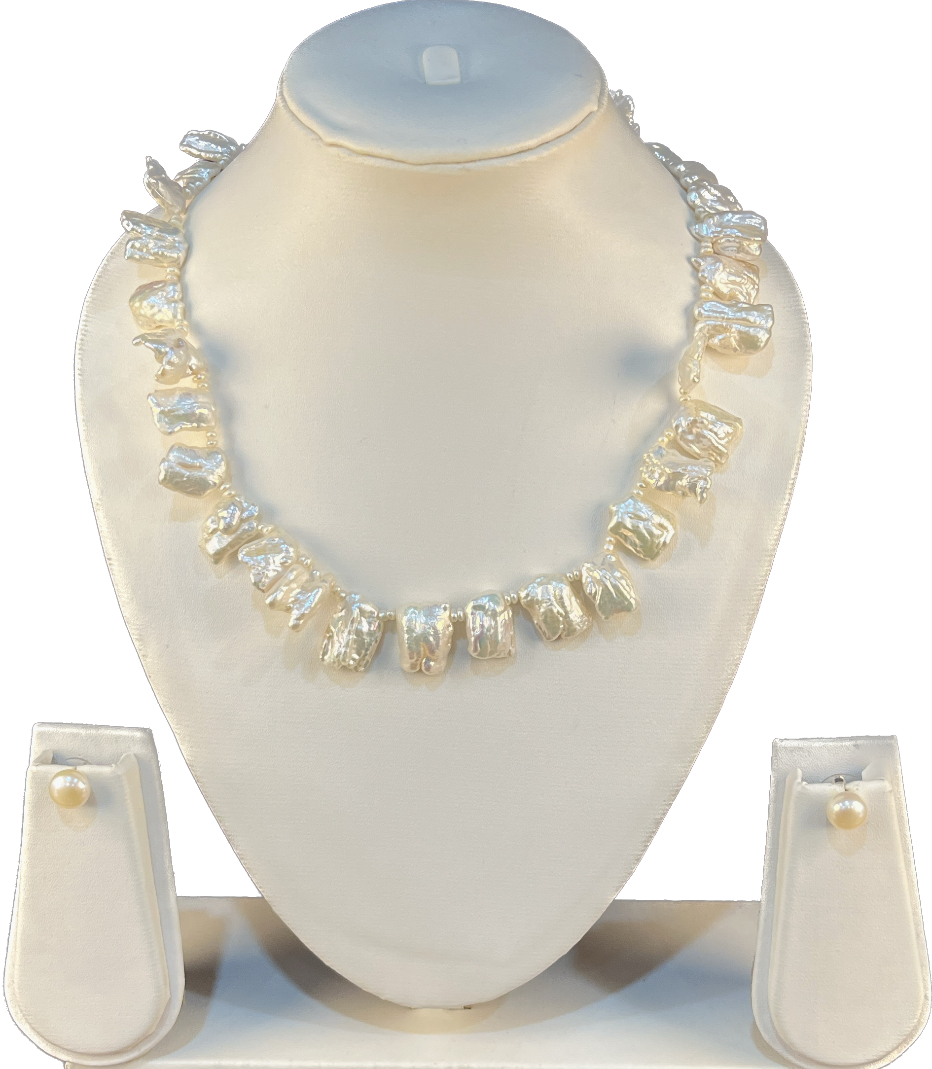 Very charming Irregular shape Biwa Pearls necklace - add to your style statement. Comes with matching white pearl studs.
