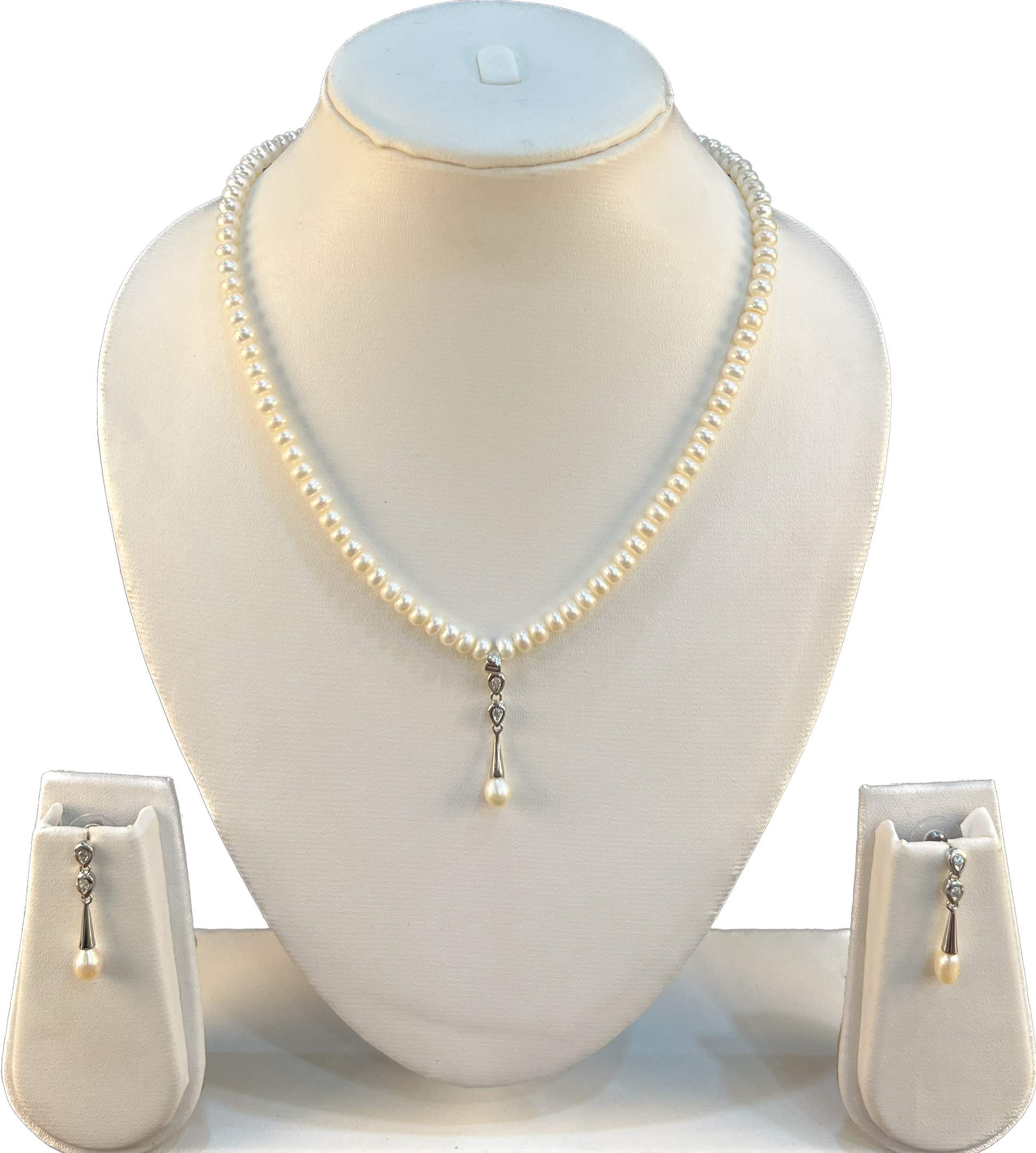 Cute ~ 4 mm white freshwater pearl set with admirable sleek pendant. Comes with matching earrings.