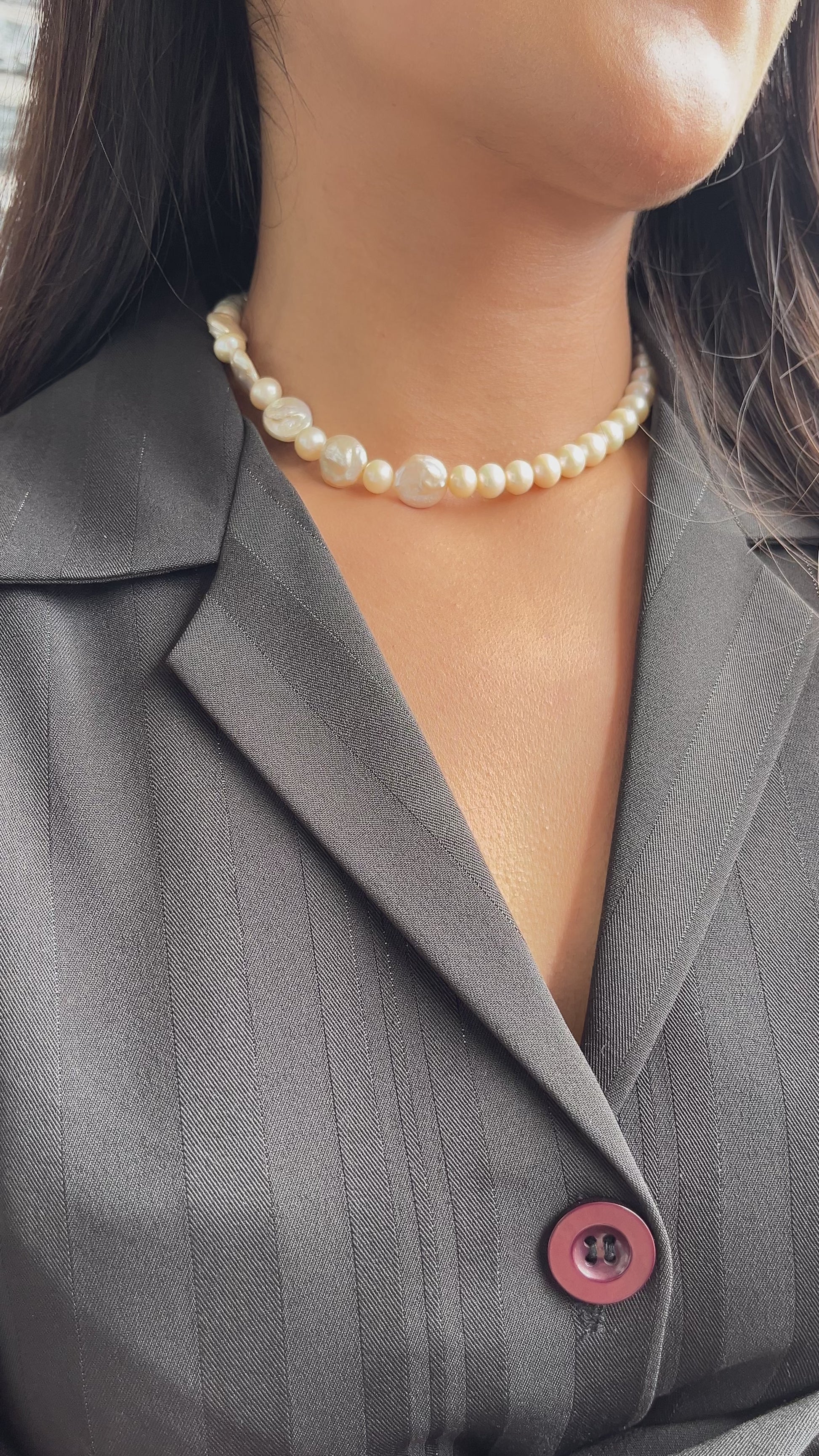 Amazing confluence of 8 mm light pinkish tinge round pearls and white coin shape Biwa real freshwater pearls