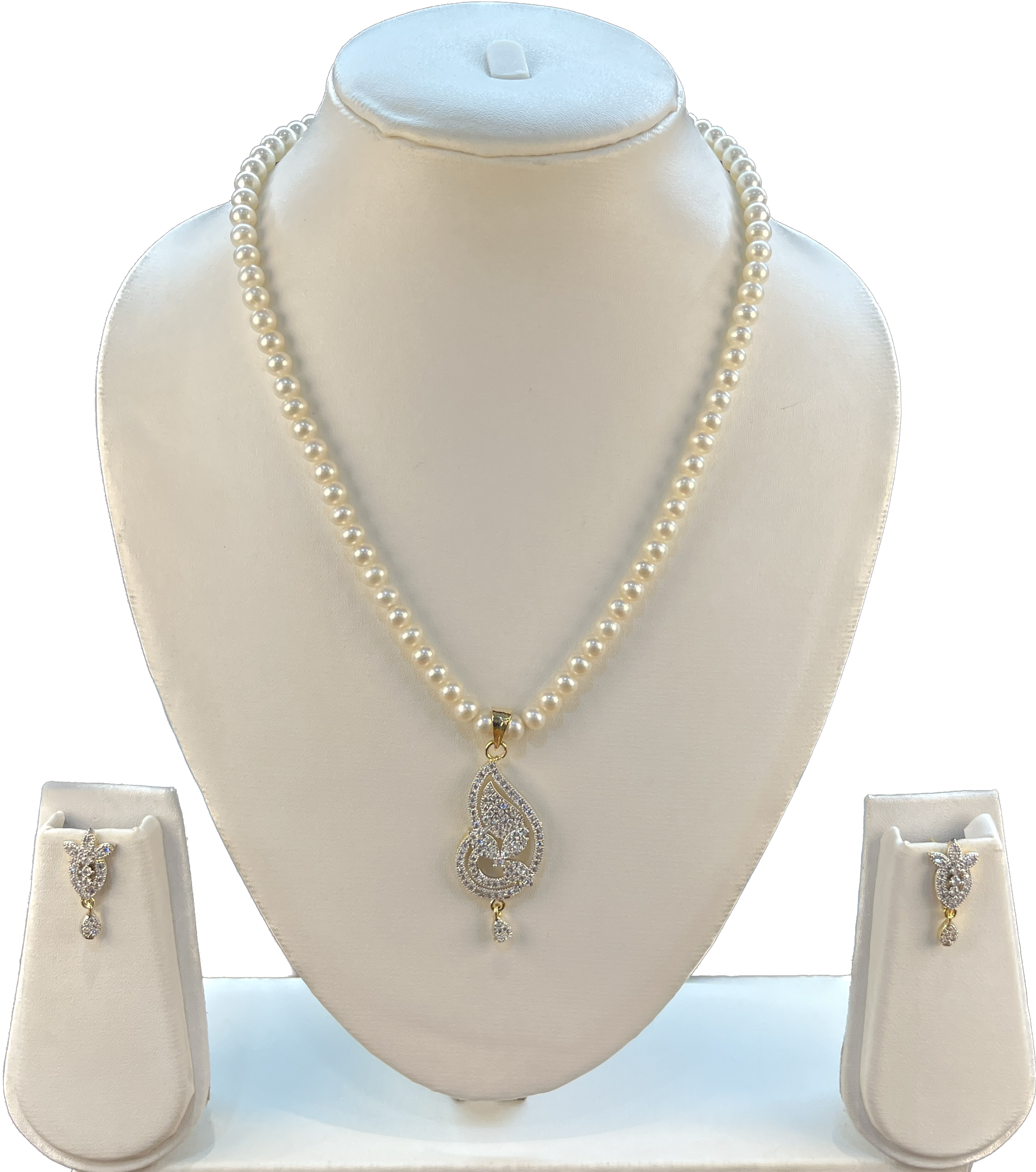 Single strand 6 mm white real freshwater pearl necklace with captivating CZ pendant. Comes with matching earrings.