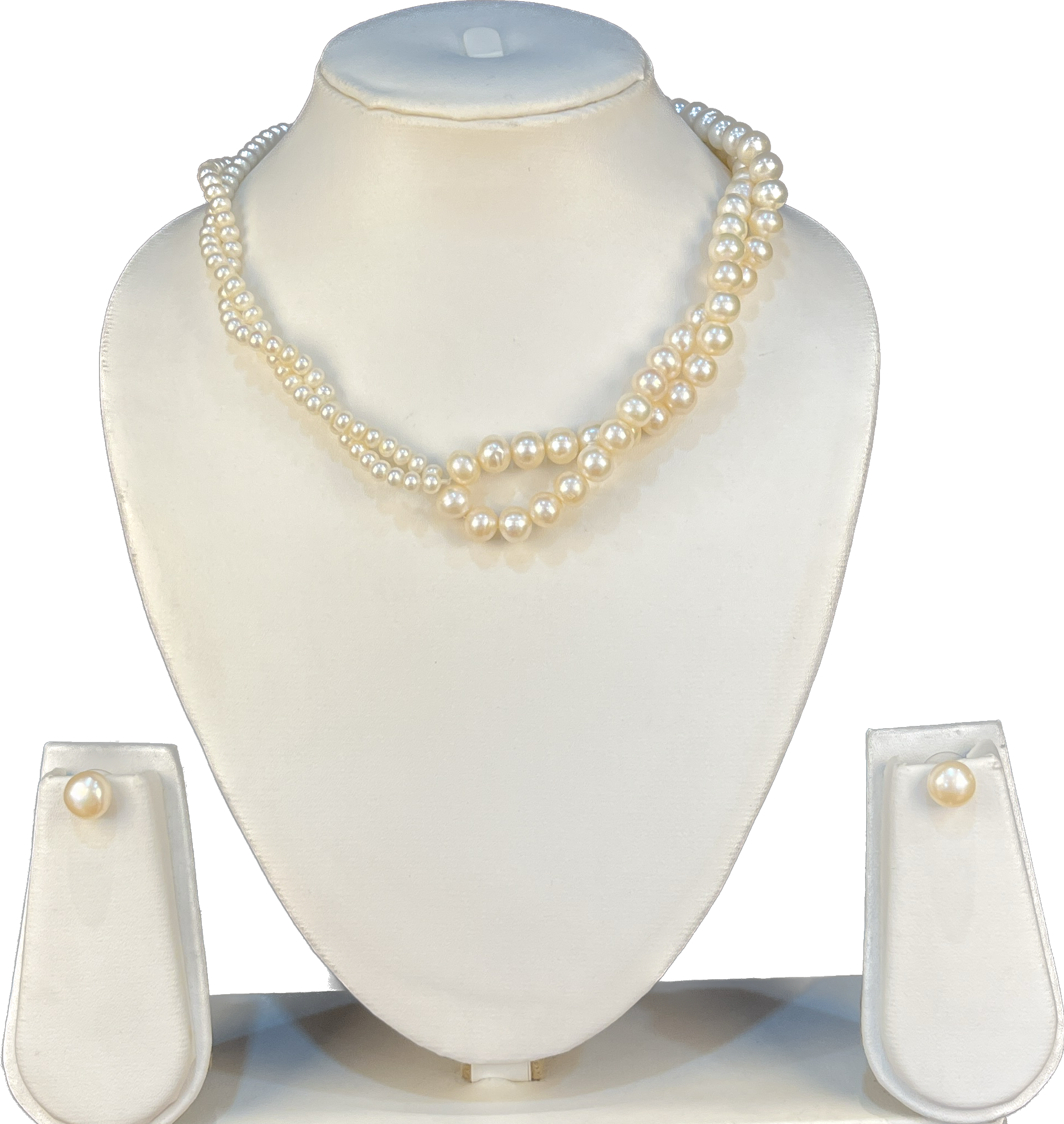 A captivating Pearl Necklace with exquisite Combination of 4mm White and 8mm Light Pink Freshwater Pearls beaded in a mesmerizing twisted fashion. Includes complementing White Pearl Stud Earrings - Explore this Perfect Pearl Jewelry Set for an enchanting look.