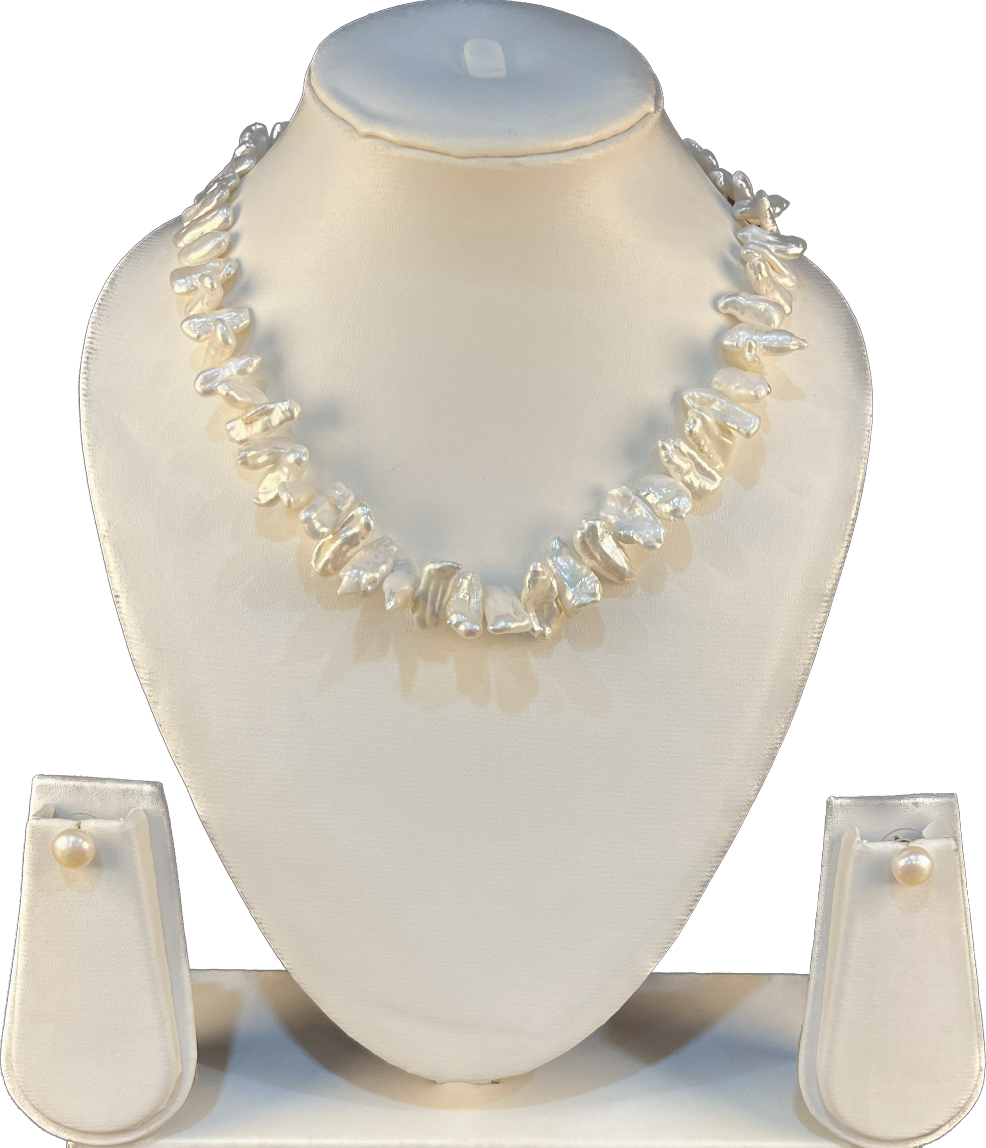 Snazzy Biwa pearl necklace to add to your swag, team up with western wear, or work wear or just carry the swag even with a saree. Comes with matching white pearl studs.