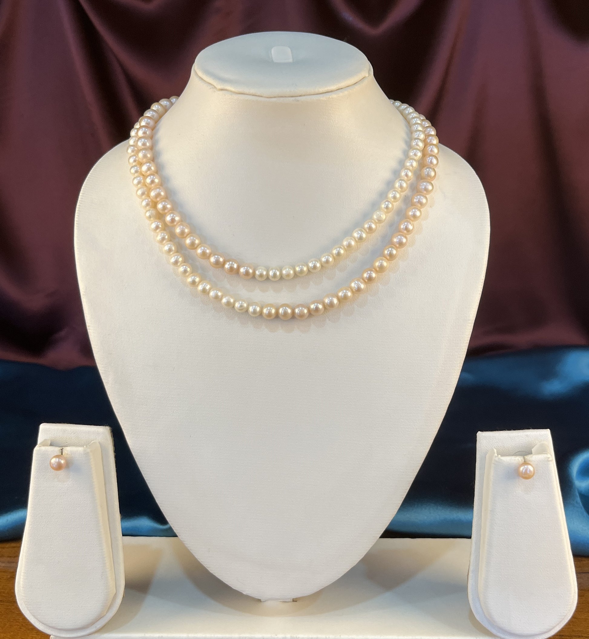 My Pearls Pink and White 6mm Round Pearls Two Lines Necklace Set