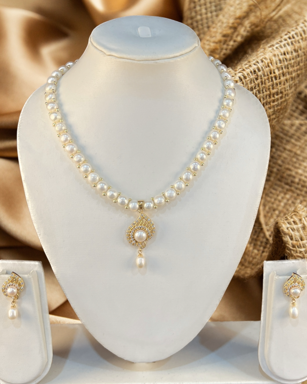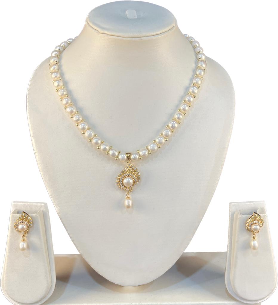 Elevate your style with our ravishing Real pearls necklace. Adorned with a button shape pearl and CZ studded beauteous pendant, and embellished with gold plated balls between the pearls, this set exudes timeless beauty. Complete with matching earrings, it's the perfect accessory to add a touch of elegance and sophistication to any ensemble.