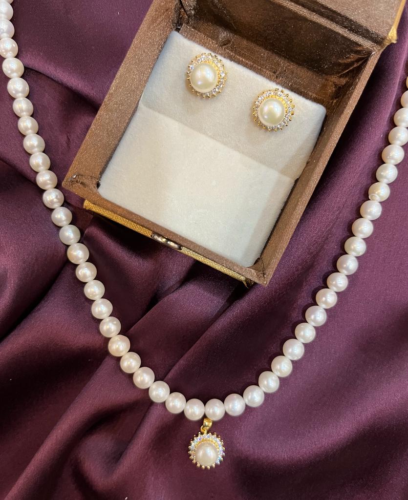 Ravishing Single Line 8 mm White Real Pearls Set with Pendant