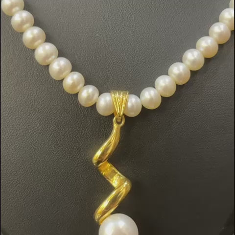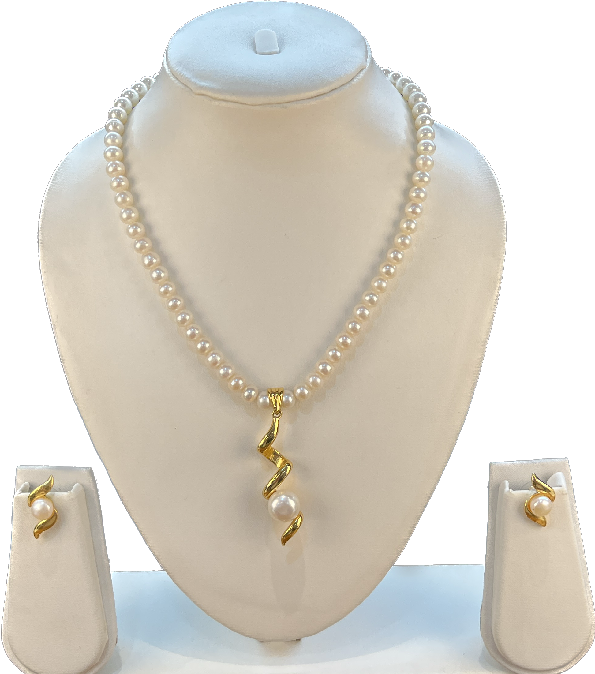 Single strand ~ 7 mm white real freshwater pearl necklace with captivating pearl studded pendant. Comes with matching earrings.