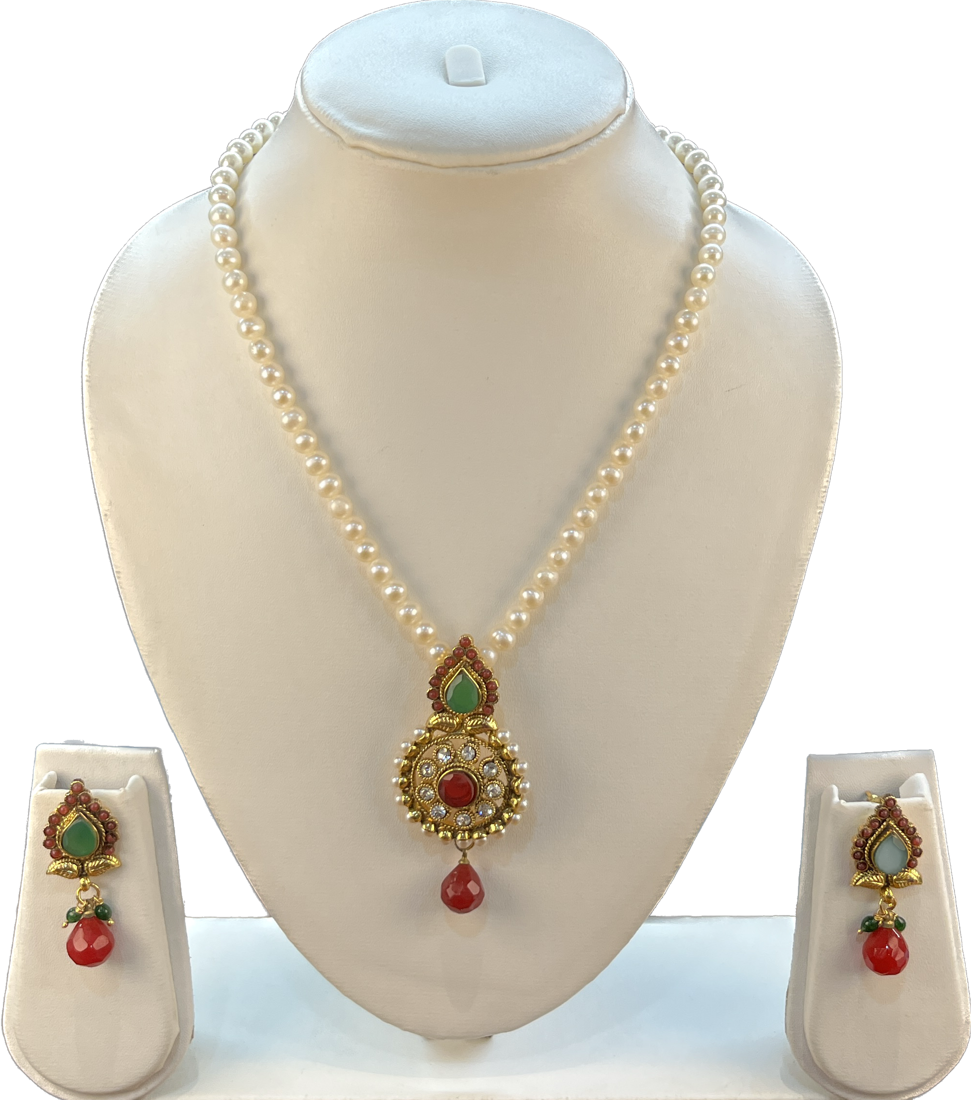 Charming ~ 6 mm white round freshwater pearls set with beauteous Chand Bali pendant & earrings.