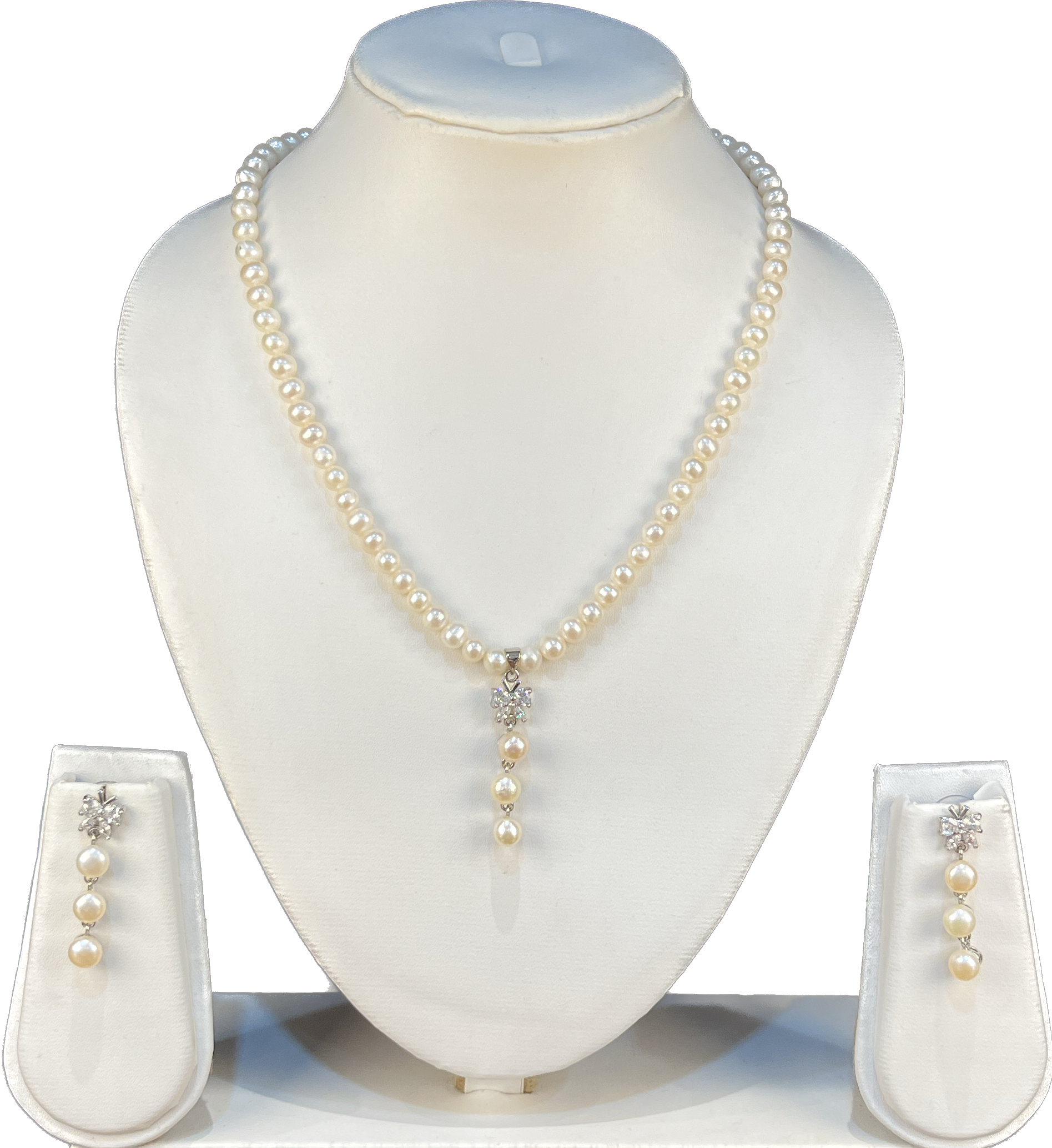 Experience cuteness at its finest with this adorable pearl set. The set includes a single line necklace featuring 6mm white genuine freshwater pearls and a captivating long pearl studded hanging pendant. Complete the look with the matching pearl studded hanging earrings for a charming and coordinated ensemble.