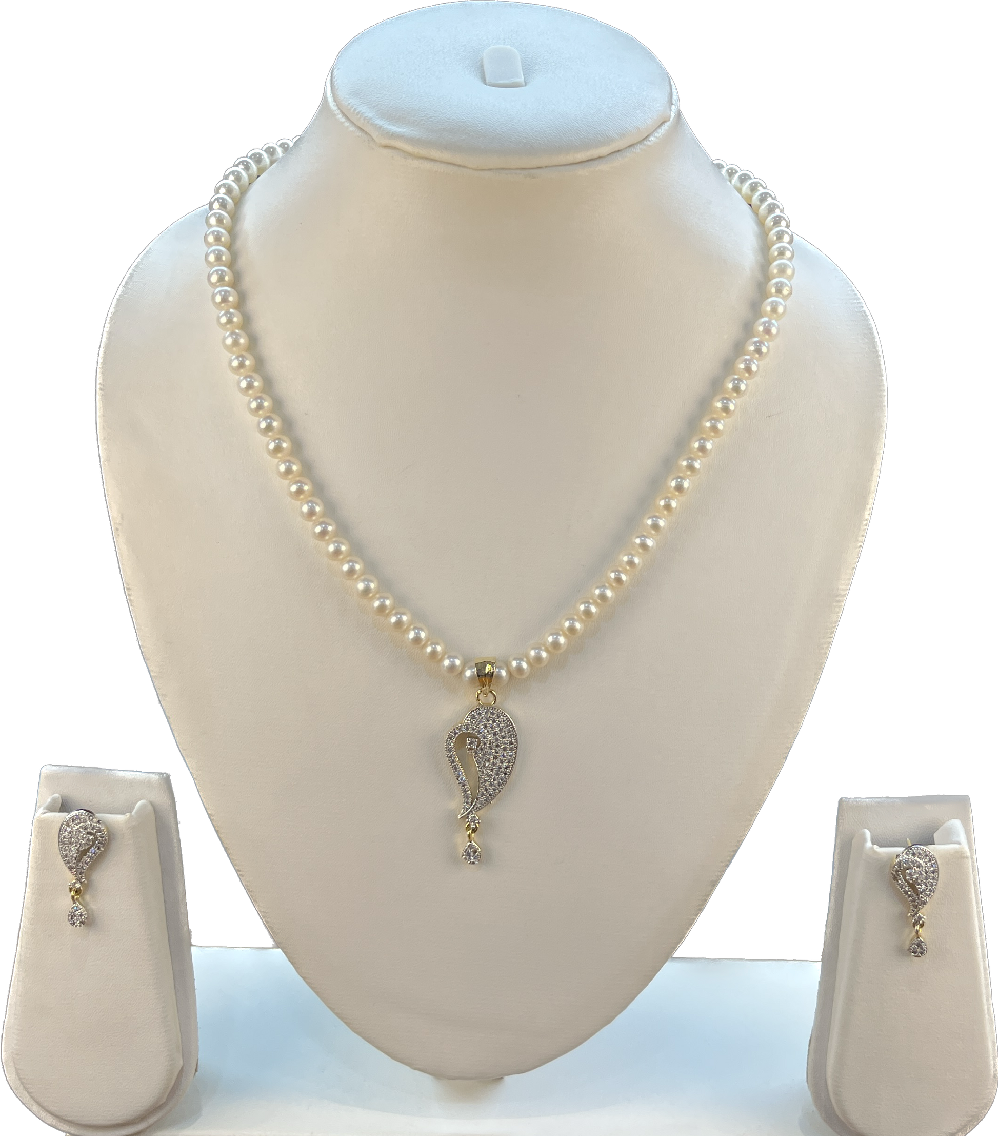 Single strand 6 mm white real freshwater pearl necklace with captivating American Diamond pendant. Comes with matching earrings.